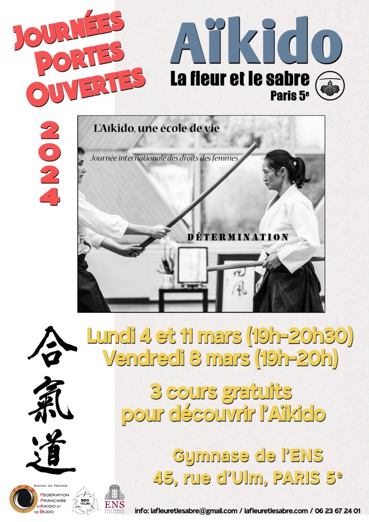 Bonjour à toutes et tous ! Nous participons aux « Journées portes ouvertes » de mars organisées par la Fédération. Alors si tu as envie de tester l’aïkido, de découvrir l’ambiance du club, ou juste de te renseigner, n’hésite pas à venir nous voir sur un des trois jours ci-dessous.